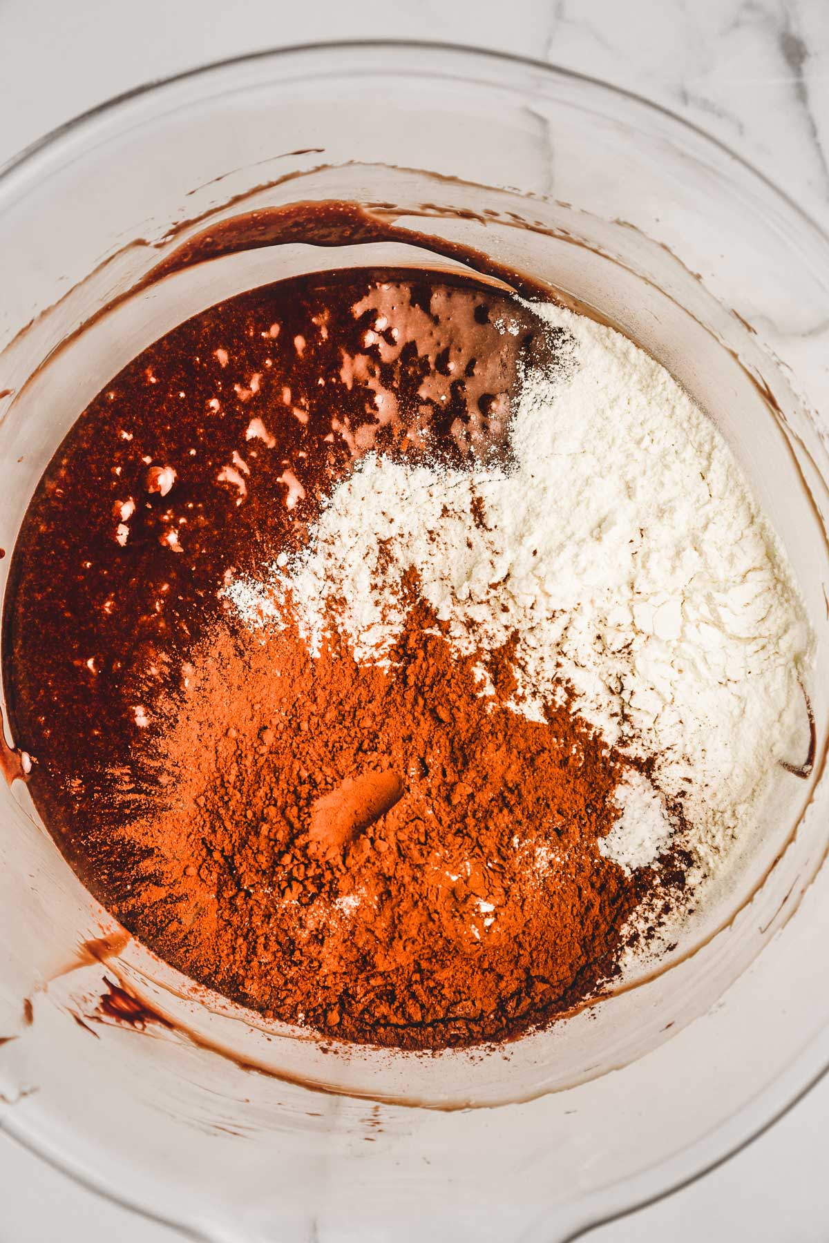 - Incorporez le mélange liquide de chocolat et beurre fondus et mélanger à nouveau au fouet électrique pendant 1 minute.