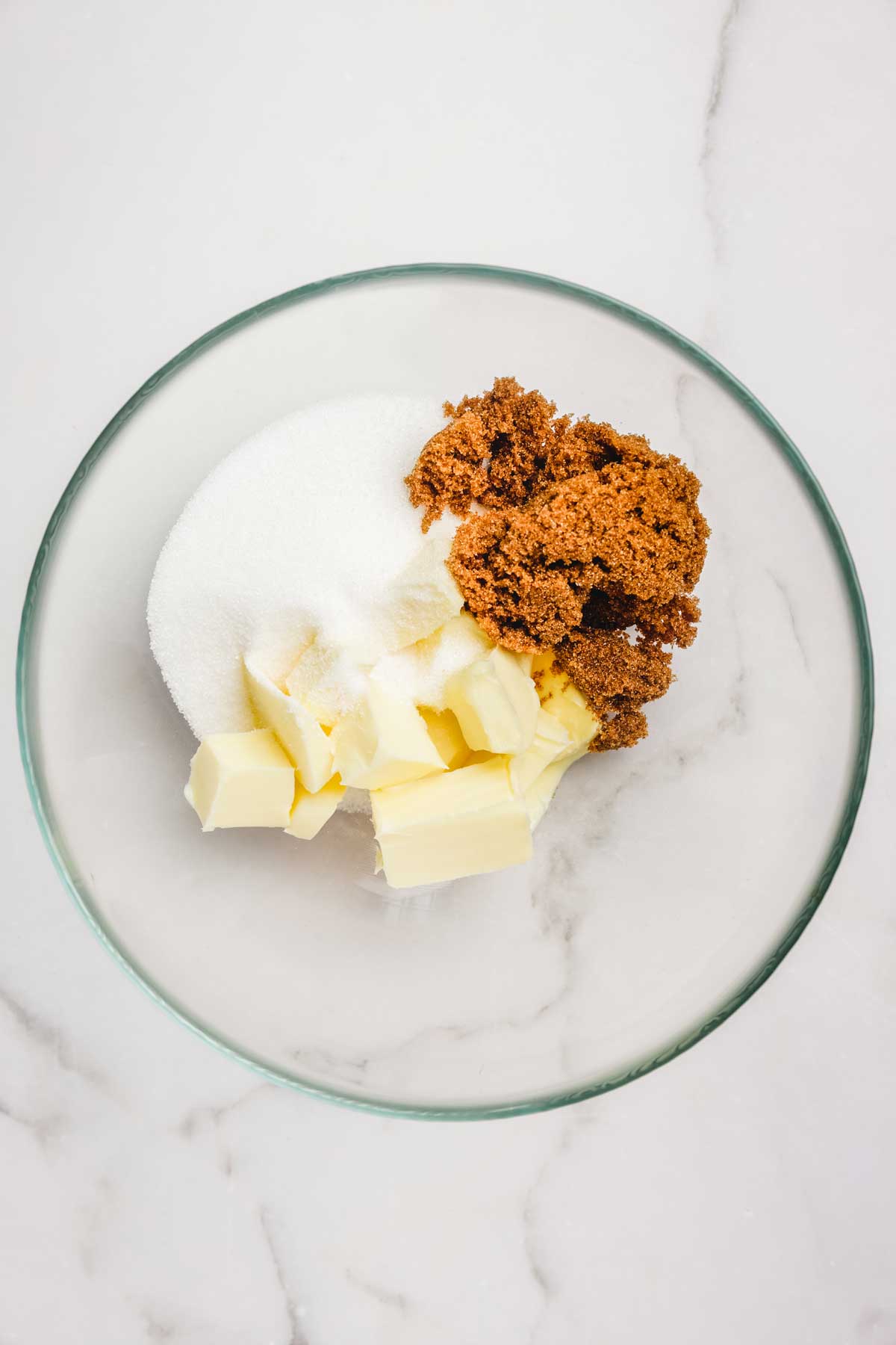 Fouetter le beurre mou avec le sucre blanc et le sucre brun dans un saladier pendant 2 à 3 minutes jusqu'à obtenir un mélange bien crémeux et lisse.