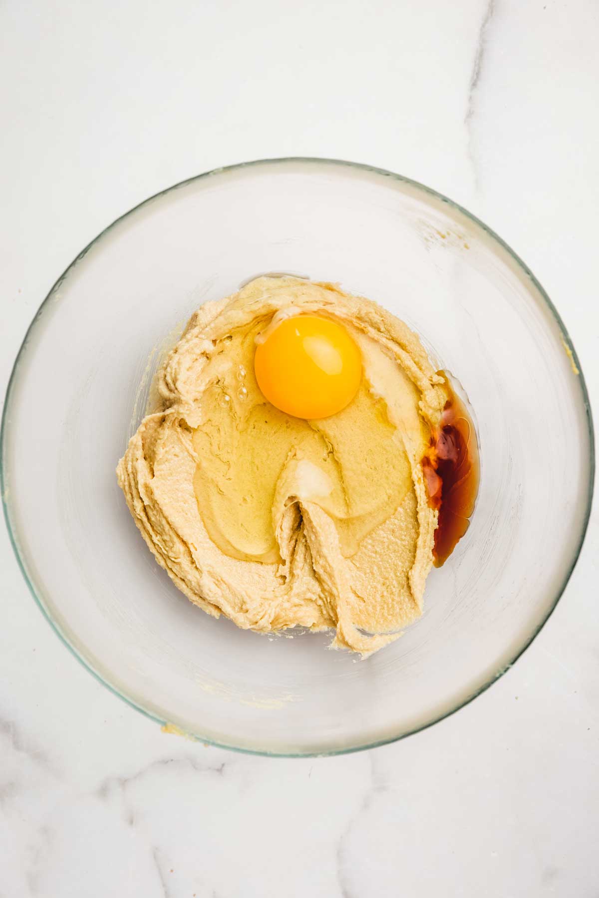 - Puis ajoutez l’œuf et l'extrait de vanille et continuez de battre encore 1 minute.