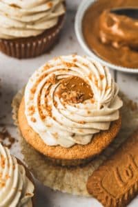 Congélation : Vous pouvez congeler les cupcakes sans le glaçage ni le crumble jusqu’à un mois. Décongelez-les au réfrigérateur, puis ajoutez le glaçage et le crumble une fois qu’ils sont complètement décongelés.