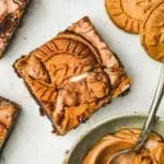 These Biscoff brownies are a twist on my classic fudgy brownie recipe. They’ve got the same gooey chocolate texture but with a Lotus cookie butter swirl and bits of crunchy Biscoff cookies for that caramelized, spiced flavor everyone loves.