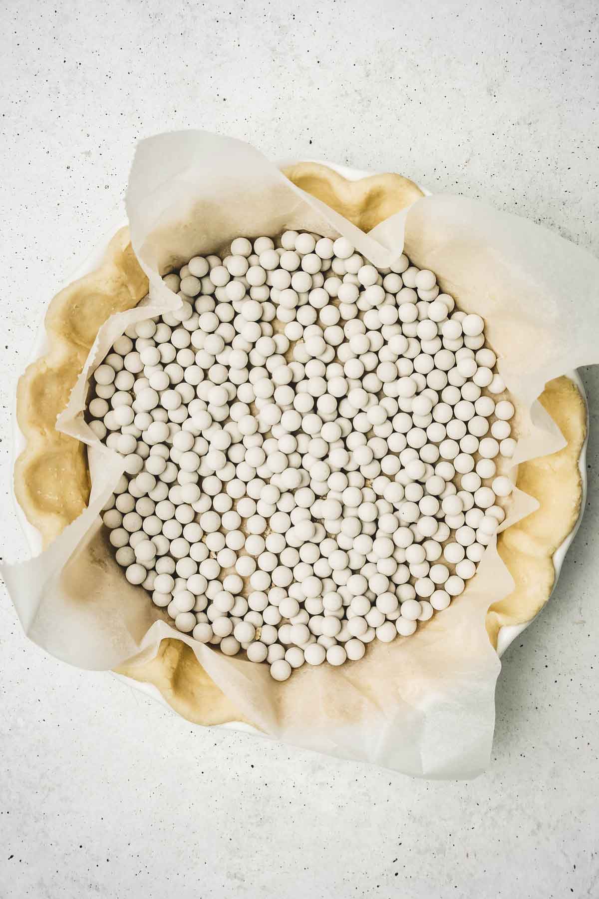 - Roll out the cold pie dough with a rolling pin on a lightly floured surface with a little flour sprinkled between two sheets of parchment paper and line your pie pan or tart ring.