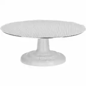 It rotates in both directions and has a non-slip pad included that stabilizes the cake and is very useful to prevent it from moving or falling.
