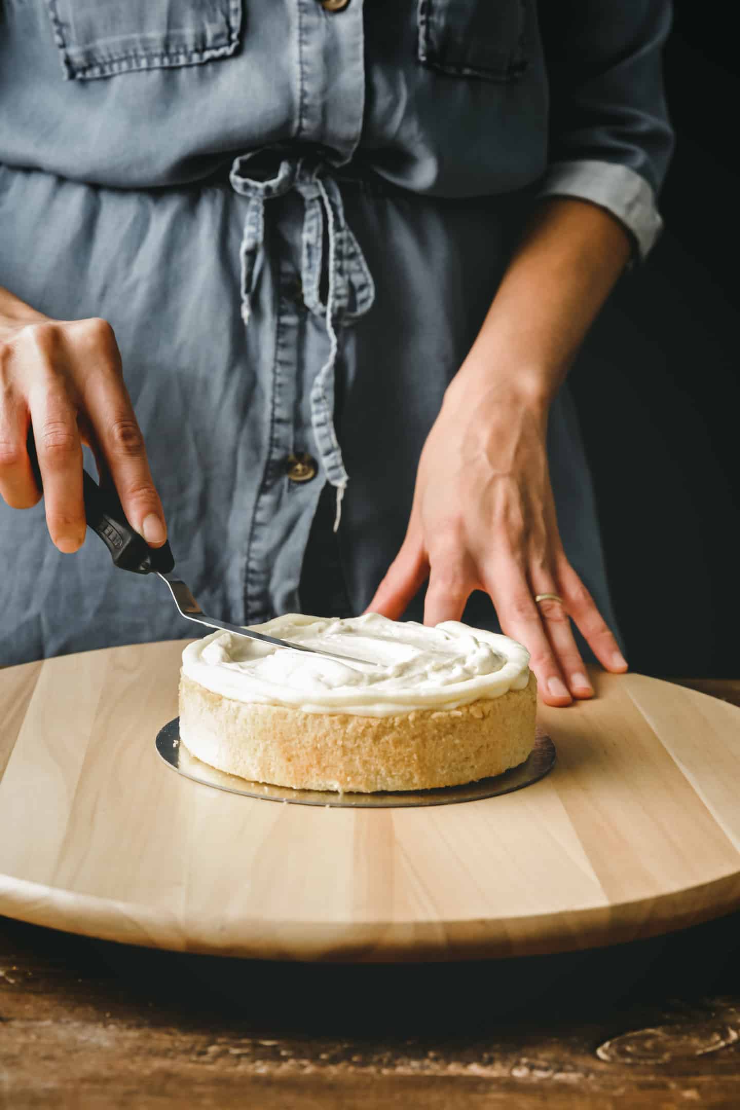 The angled spatula is perfect for smoothing the filling and applying an exterior frosting underlay. But be careful, get the right size (9 inch / 22 cm).
