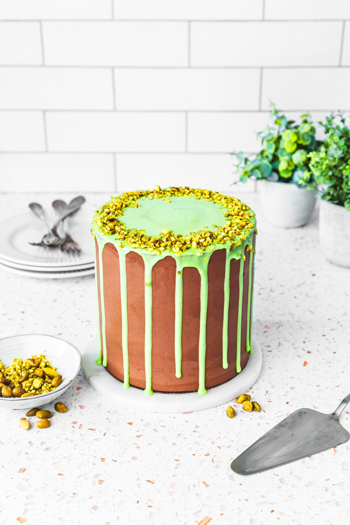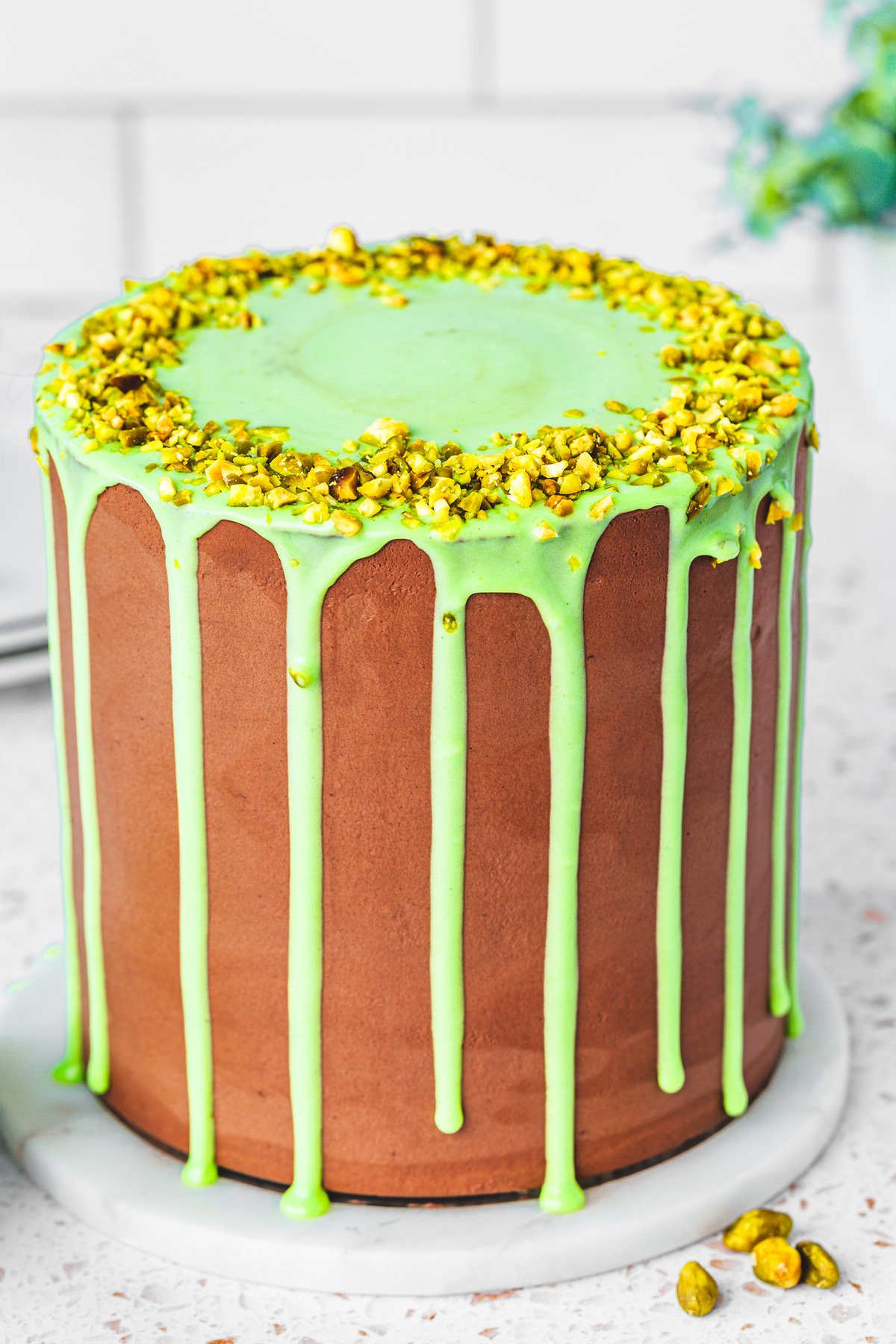 - Drizzle the green chocolate drip over the top edge of the cold cake, let it drip down the sides add some crushed pistachios, and chill the finished cake for at least 2 more hours before serving.