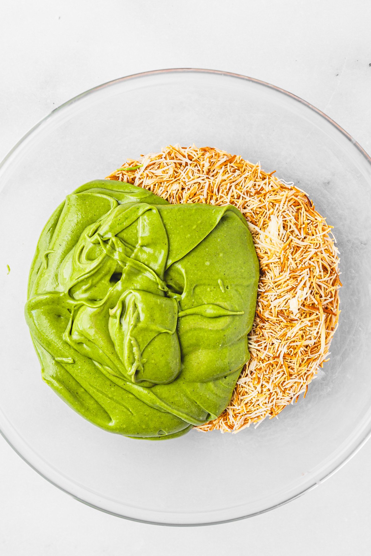 - In a bowl, mix pre-toasted kataifi with pistachio spread and a bit of green food coloring, if desired.