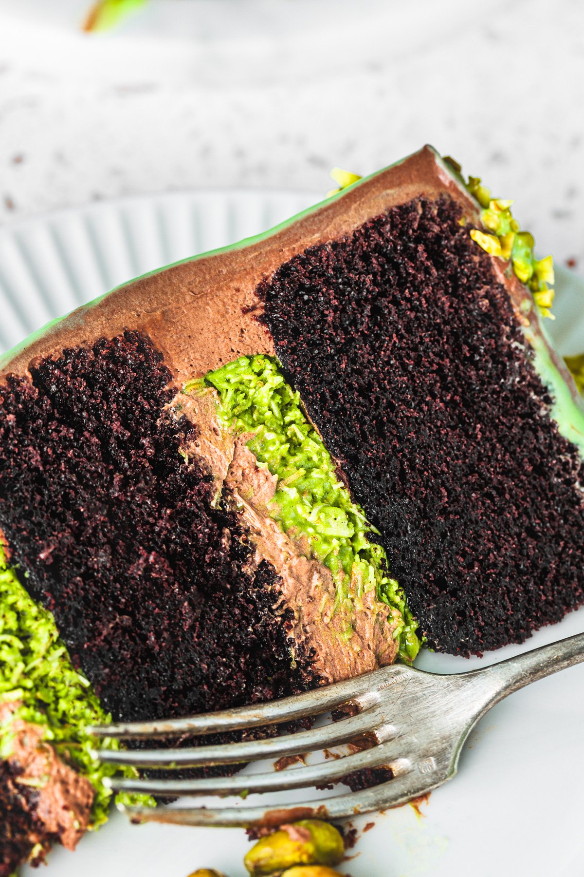 It’s made with a soft and moist chocolate buttermilk cake, a whipped chocolate ganache, and a dreamy filling of pistachio cream and toasted kataifi. Every bite is creamy, crunchy, and chocolatey.