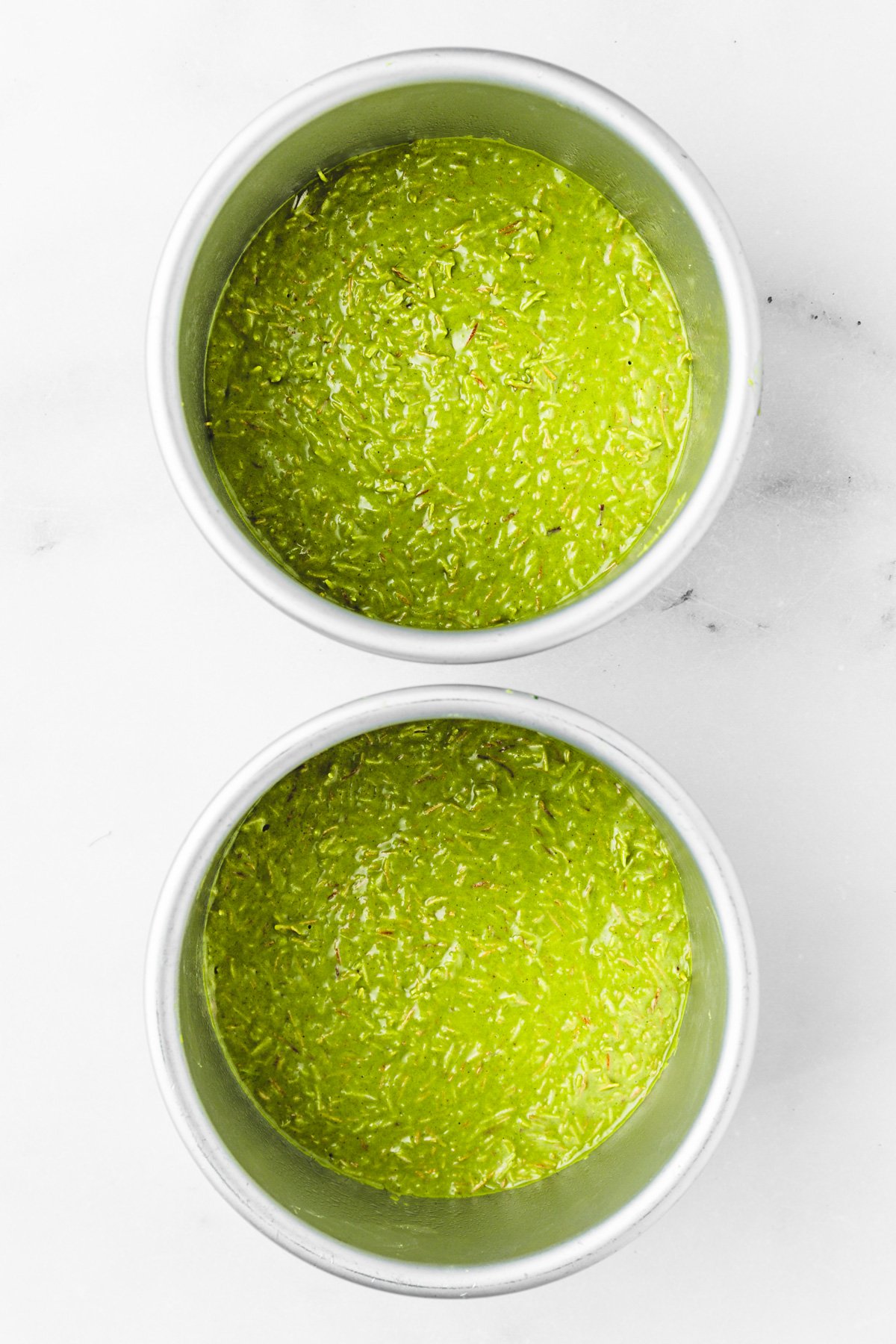 - Divide the batter evenly between three 6-inch (15 cm) cake pans lined with parchment paper at the bottom.