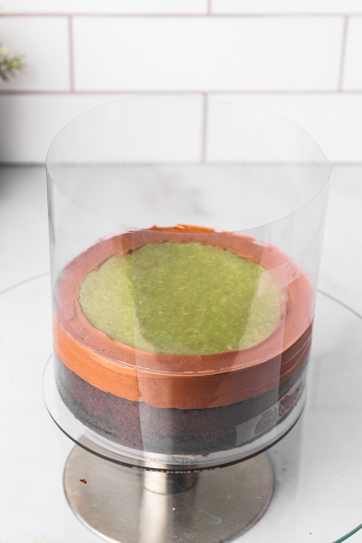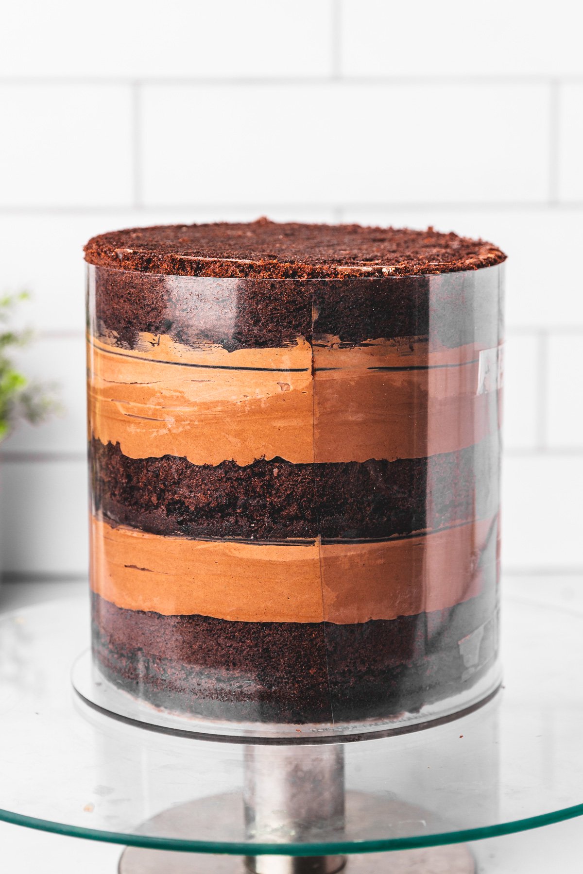 Start by assembling the cake either in a deep cake pan lined with plastic wrap or using a tall acetate roll for a straight and neat finish. Place the first chocolate cake layer at the bottom.