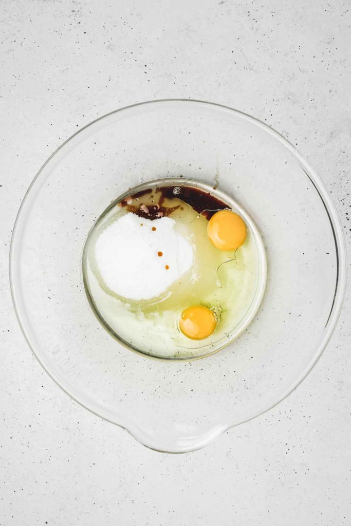 - In a large container, place the vegetable oil, sugar, eggs and vanilla and mix with a hand whisk or electric mixer to obtain a smooth mixture.