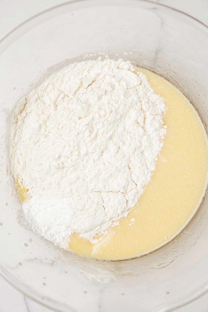 - Step 2 Add dry ingredients: Add the flour, baking powder and pinch of salt and mix with a hand whisk or a rubber spatula to incorporate them gently and until you have a smooth batter.