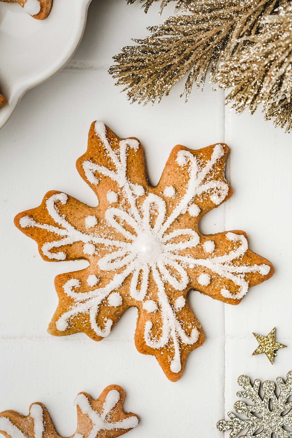 This snowflake cookie recipe with its pretty sugar icing is made with gingerbread-flavored cookie dough, which is a spice blend of cinnamon, ginger, nutmeg, and cloves.