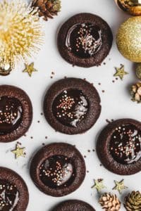 Gently flatten each ball with the palm of your hand, then use your thumb or the back of a teaspoon (or a small cookie scoop) to press a small well into the center of each cookie.