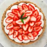- Gently decorate the top of the tart with strawberry slices, and add edible flowers, basil, or fresh mint leaves as garnish.