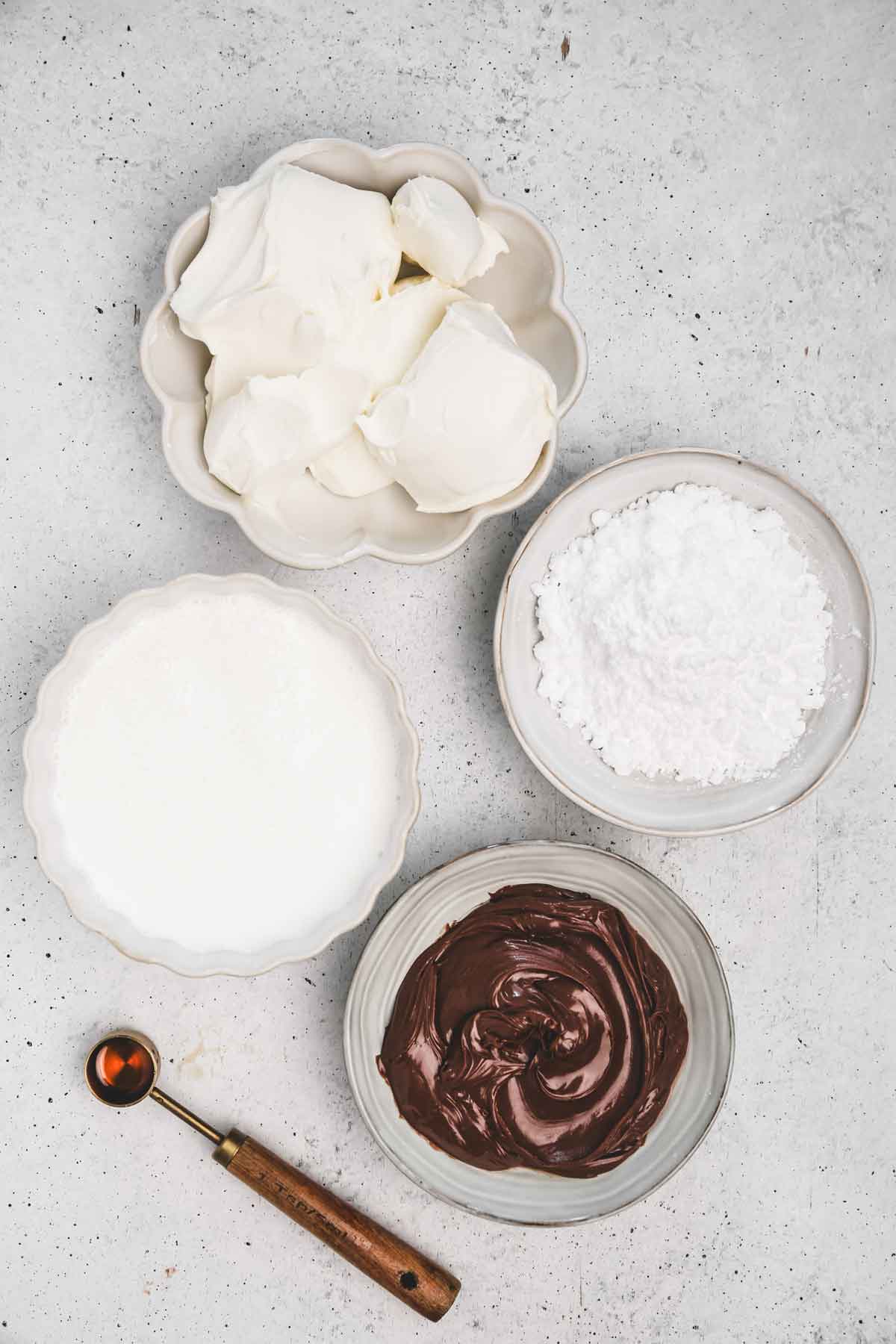 - Place the cream cheese, cold heavy cream, powdered sugar, Nutella, vanilla, and cocoa powder (if using) in a large mixing bowl.