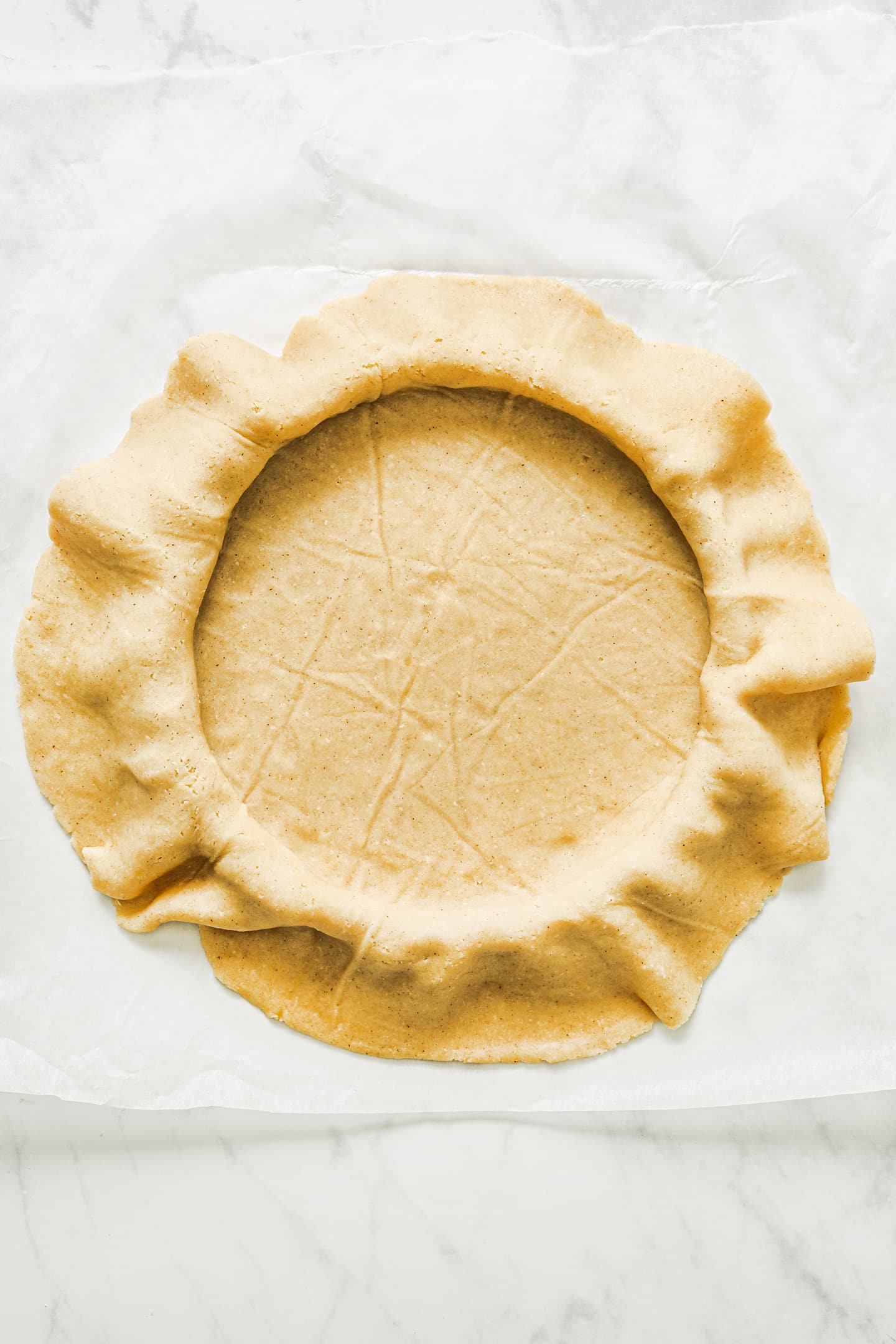 - Take the dough out of the fridge and place it in an 8 inch / 20 cm diameter pie circle on a baking sheet covered with baking paper.
