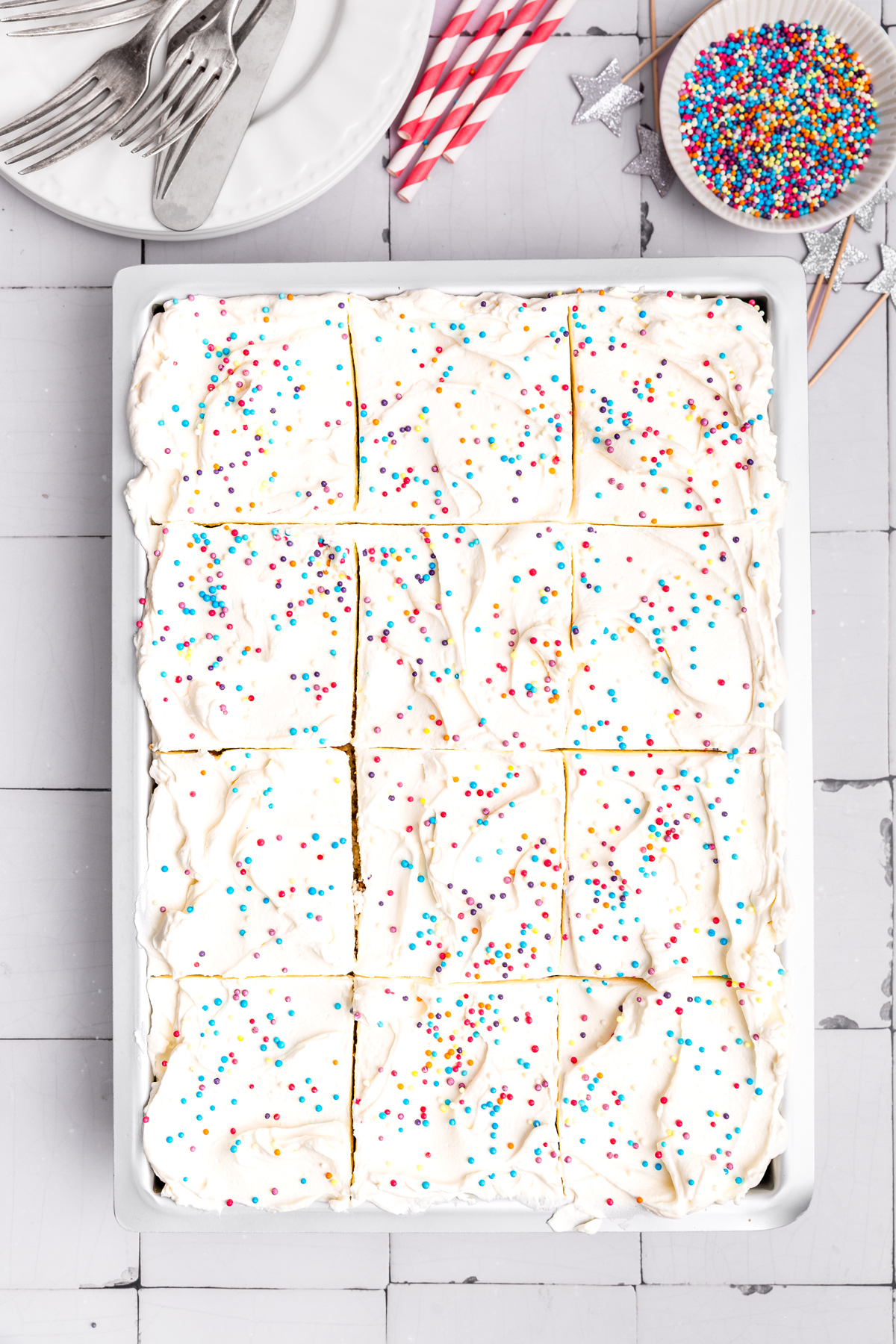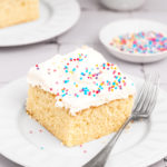 Vanilla sheet cake made with a soft and fluffy vanilla sponge, baked in a rectangular pan (approx. 9x13-inch / 23x33 cm), and topped with a light vanilla frosting for an easy and family-friendly dessert.