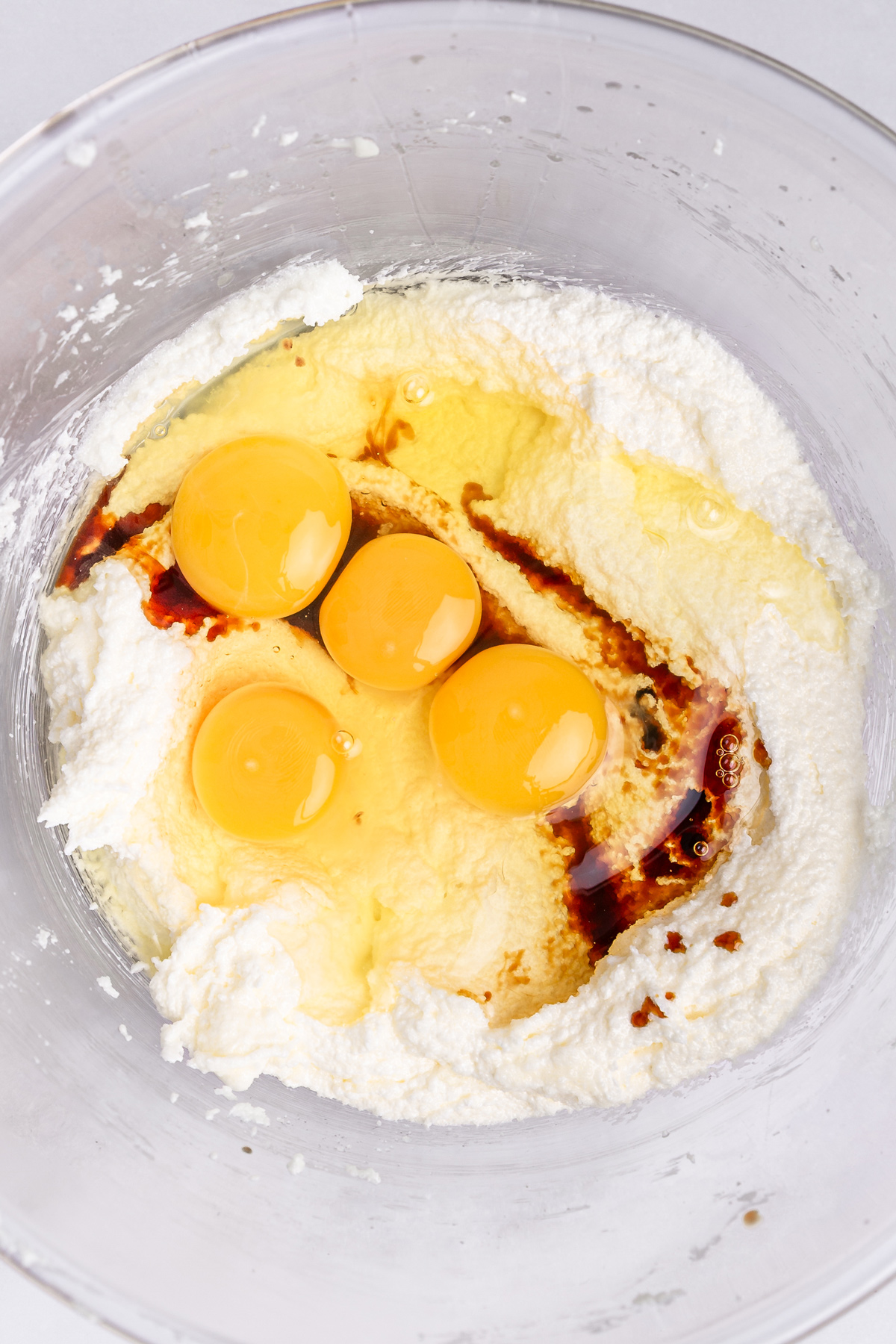 - Add the eggs and vanilla and mix until fully combined and smooth