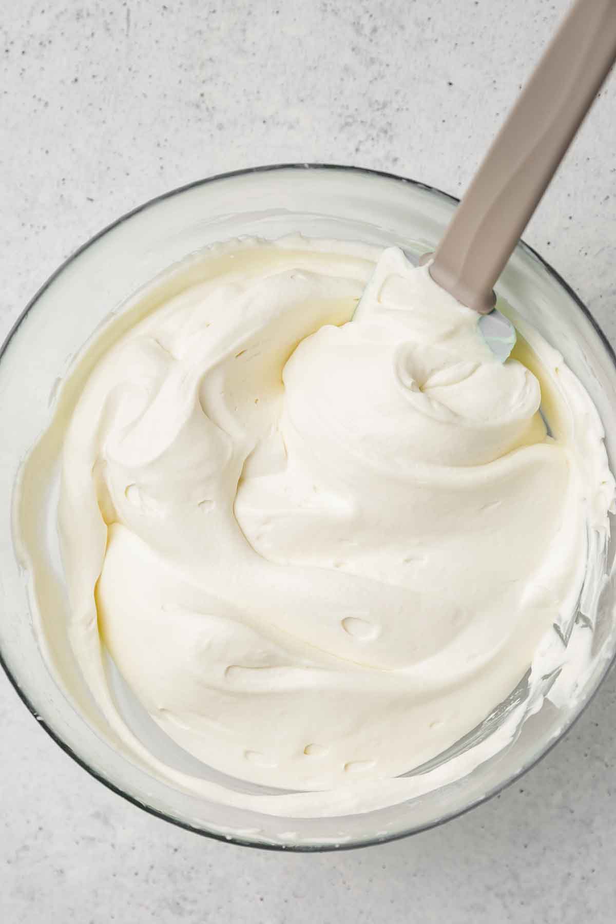 - Whip the cooled white chocolate ganache with an electric mixer for 2 minutes on medium-low speed until it becomes smooth and firm.