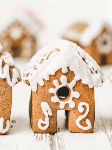 Ce gâteau de Noël Village en pain d'épices est parfait pour terminer la saison des fêtes ! Un gâteau aux amandes parfumé à la cannelle, fourré d'une ganache au chocolat au lait, recouvert de crème fouettée maison et décoré d'un village de biscuits en pain d'épices.