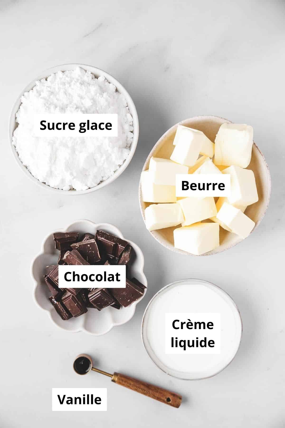 - Crème au beurre chocolat : Beurre, sucre glace, chocolat fondu, crème liquide, vanille et cacao en poudre.