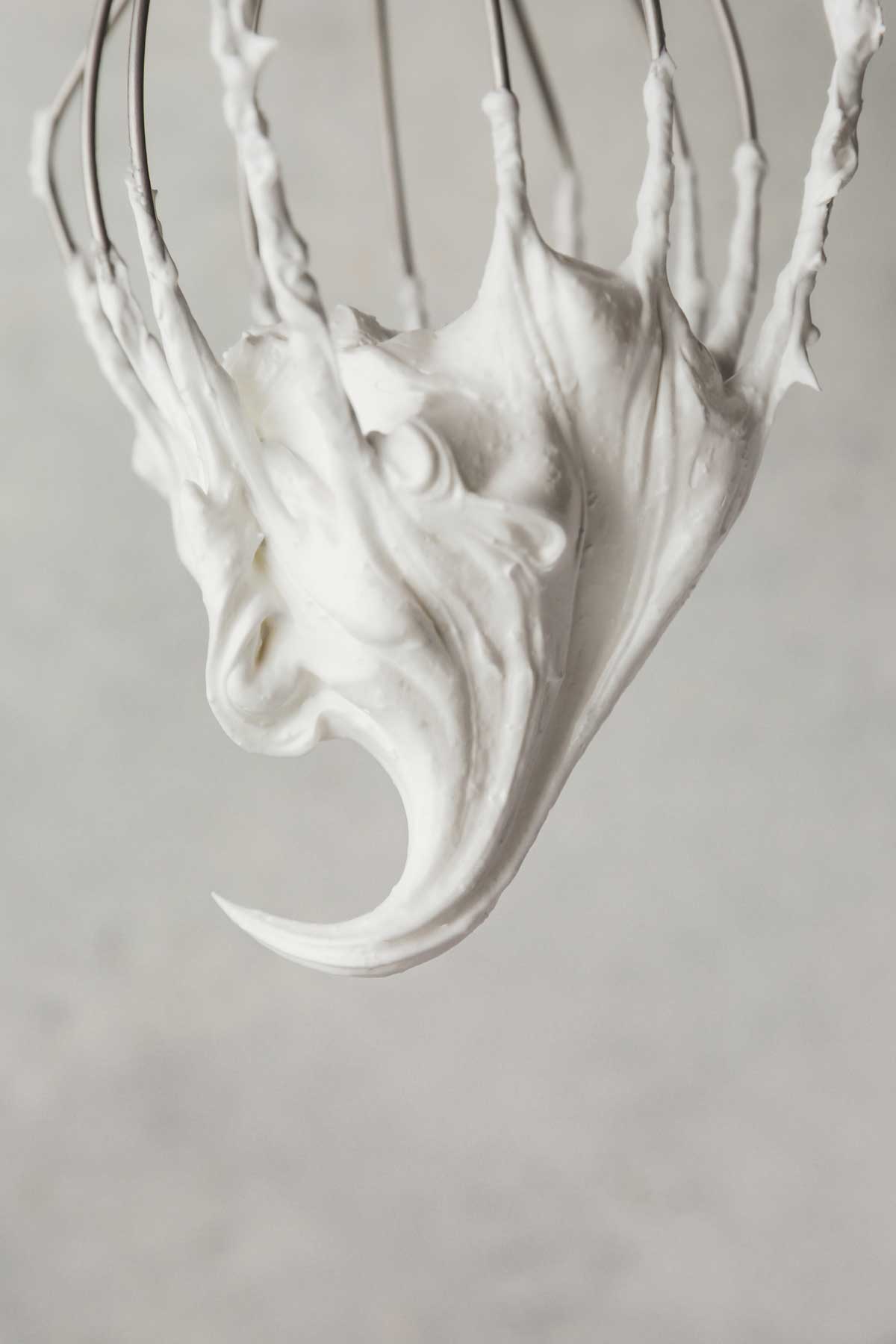 - Fouetter alors à vitesse rapide la meringue jusqu'à obtenir une texture ferme, brillante et des pics fermes (bec d'oiseau).