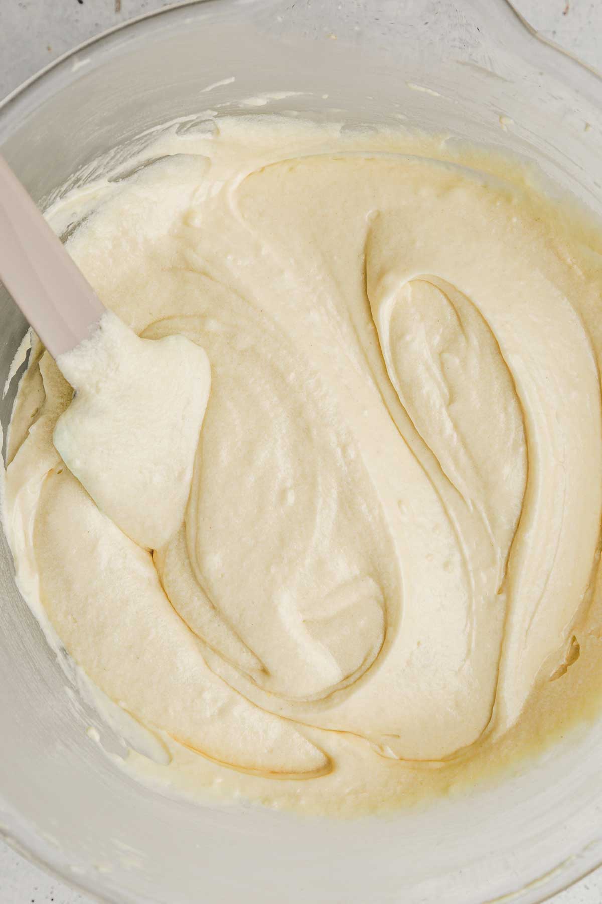 - Incorporez alors le mélange d'ingrédients secs et le lait fermenté alternativement et en plusieurs fois à l'aide d'une spatule souple juste assez pour avoir un mélange homogène et lisse.