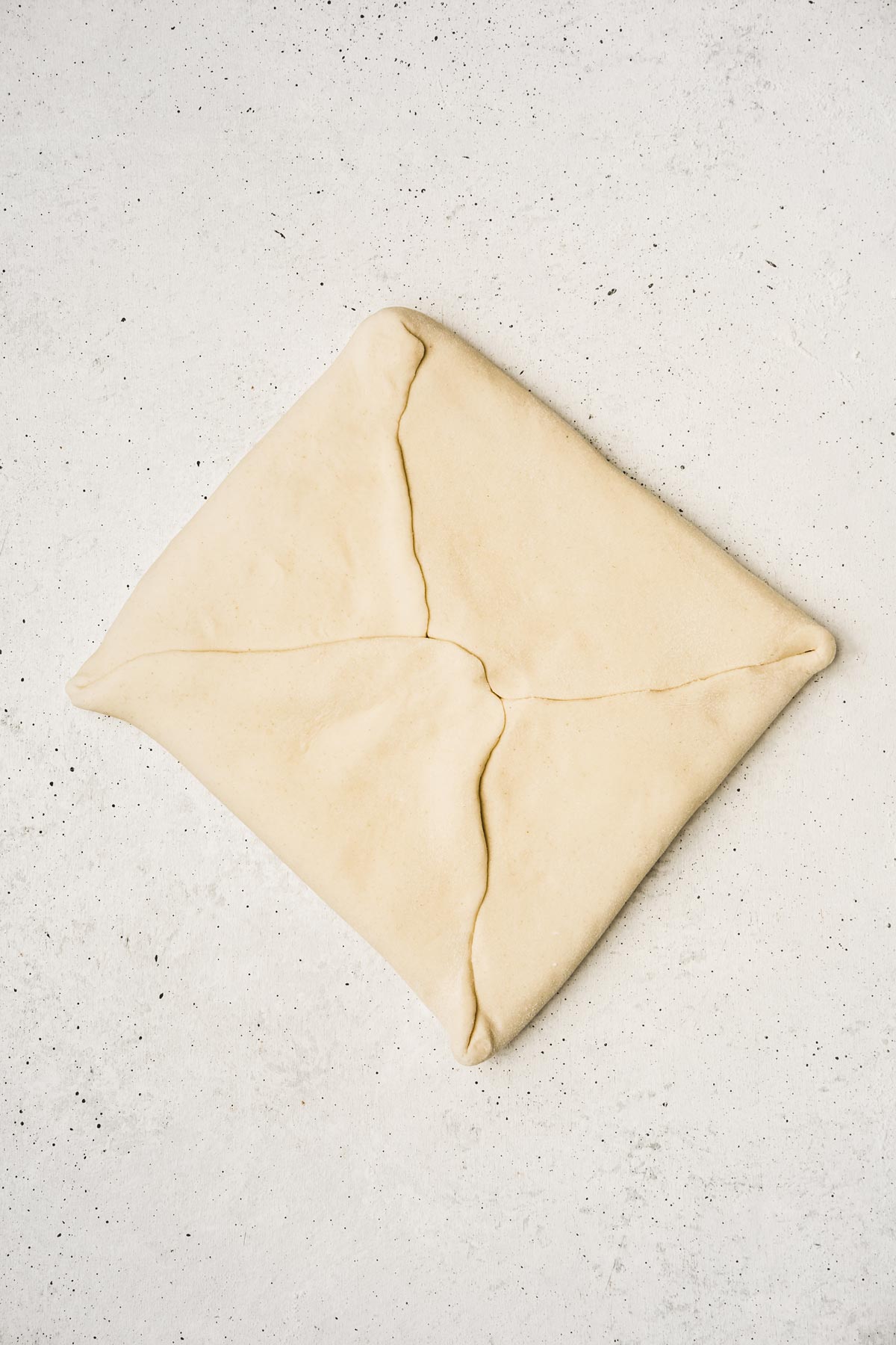 - Placez le beurre au centre de la pâte et repliez les coins de la pâte sur le beurre pour le recouvrir entièrement.